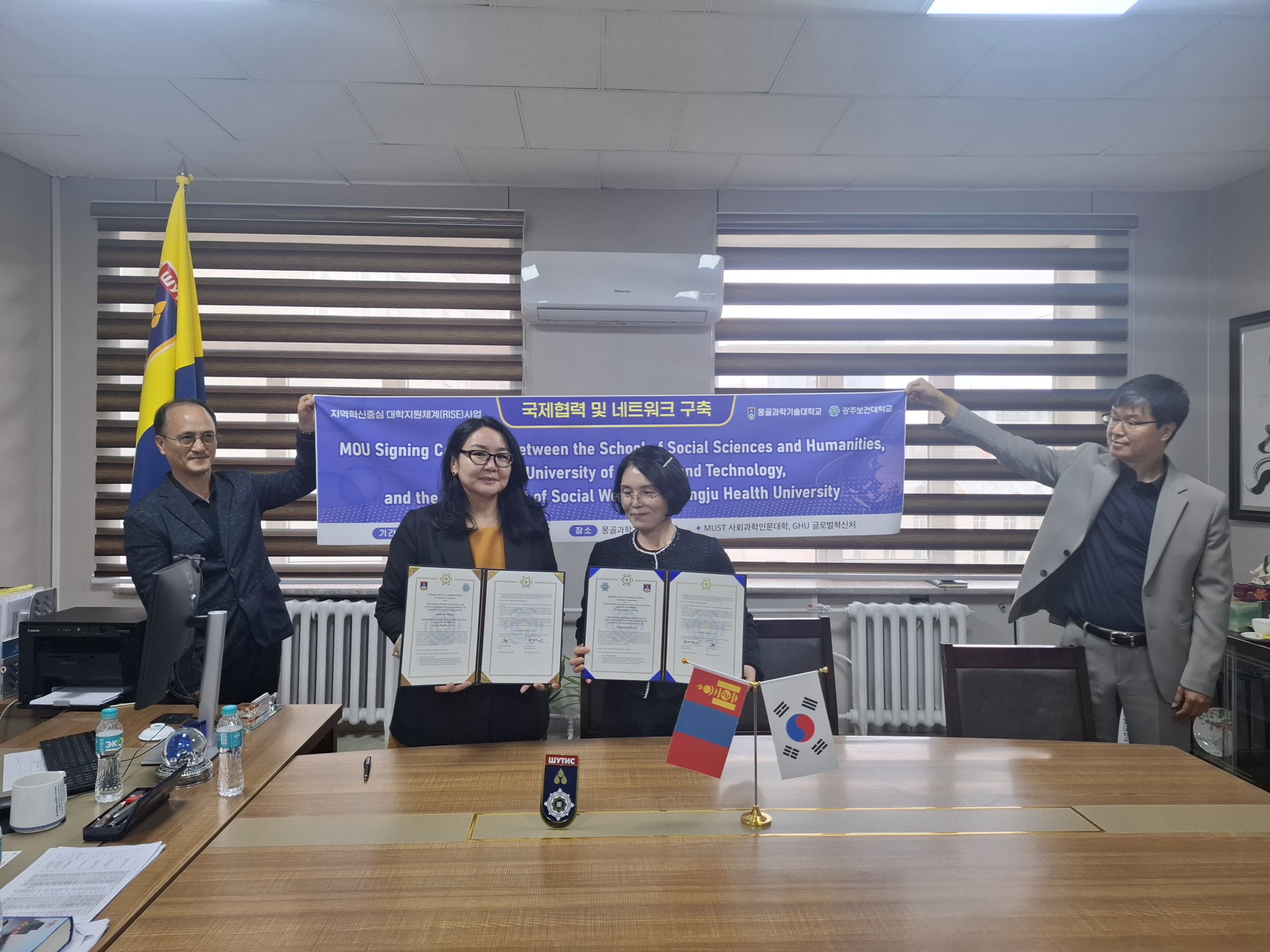 2025 оны 9-р сарын 23-ны өдөр БНСУ-ын Гуанжугийн Эрүүл Мэндийн Их Сургуулийн төлөөлөгчид ШУТИС-ийн НХС-д зочилж Хамтын ажиллагааны санамж бичигт талууд гарын үсэг зурлаа. Уулзалтад Гуанжугийн Эрүүл Мэндийн Их Сургуулийн профессор Hyung Hee Kim, профессор Yoseb Kim, профессор Young Geun Kim нар, НХС-ийн талаас захирал Я.Төгөлдөр, эрдэмтэн нарийн бичгийн дарга Л.Амартүвшин, Нийгмийн ухааны тэнхмийн эрхлэгч Н.Ариунтуяа, сургалт, чанарын албаны дарга С.Туяа, дэд профессор Ч.Должинсүрэн, ахлах багш Н.Нямдорж нар оролцож олон улсын төсөл дээр хамтран ажиллах, эрдэм шинжилгээ, судалгааны чиглэлээр санал солилцож хамтран ажиллахаар тогтлоо.