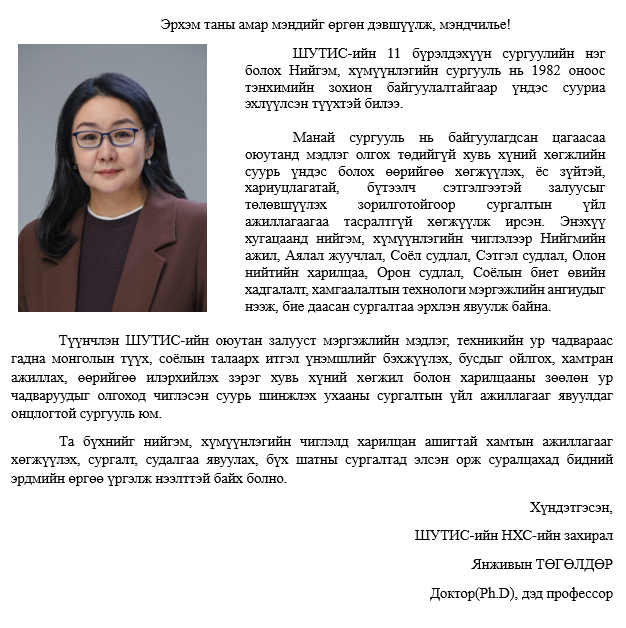 1982 онд МУИС-иас Политехникийн Дээд Сургууль (ПДС) бие даасан сургууль болоход нийгэм, хүмүүнлэгийн салбарын багш нарыг Философийн тэнхим, Түүхийн тэнхим, Улс төр эдийн засгийн тэнхмүүдийг 30 гаруй профессор багш, 3 туслах ажилтантайгаар байгуулж байсан нь өнөөдрийн Нийгэм, хүмүүнлэгийн сургуулийн тулгын чулуу тавигдсан үе юм. ШУТИС-ийн түүхэнд явагдсан зохион байгуулалтын бүтцийн шинэчлэлтийн хүрээнд манай сургууль нь 2000 онд Хүмүүнлэгийн сургууль, 2009 онд Нийгмийн технологийн сургууль, 2014 онд Бизнесийн удирдлага, хүмүүнлэгийн сургууль, 2025 оноос Нийгэм, хүмүүнлэгийн сургууль болж шинэчлэгдэн зохион байгуулагдсан юм. Нийгэм хүмүүнлэгийн сургууль нь Монгол Улсын хөдөлмөрийн зах зээлийн эрэлт, хэрэгцээ бүхий, хөтөлбөрийн магадлан итгэмжлэл хийгдсэн Аялал жуулчлал, Сэтгэл судлал, Нийгмийн ажил, Олон нийттэй харилцах ажил мэргэжлүүдээр бакалавр, магистрын түвшинд, Соёл судлал, Соёлын биет өвийн хадгалалт, хамгаалалтын технологи мэргэжлүүдээр магистрын түвшинд, Нийгмийн ажил, Соёл судлал мэргэжлүүдээр докторын түвшний сургалт, эрдэм шинжилгээний ажлуудыг эрхлэн явуулж байна. Манай эрдмийн хамт олны хичээл зүтгэлийн үр дүнд төгсөгчид эх орныхоо нийгэм, эдийн засаг, үйлдвэрлэл, шинжлэх ухаан, технологийн олон салбарт амжилттай, нэр хүндтэй ажиллаж байна. ШУТИС нь Монгол улсын тэргүүлэх их сургуулиудын нэг бөгөөд их сургуулийн шинэчлэлтийг амжилттай хэрэгжүүлж байна. Дэлхийн хэмжээнд гадаадын 180 гаруй их дээд сургууль, судалгааны байгууллагатай хамтран ажилладаг. Оюутнуудад орчин үеийн дээд боловсрол эзэмшиж, нийгэмд байр сууриа олж, амьдралын зорилгоо биелүүлэхэд нь туслах зорилгоор сургалт, судалгаа, үйлдвэрлэлийг нэгтгэх замаар сургалтын чанарыг сайжруулж олон улсад өрсөлдөх мэдлэг, чадвартай мэргэжилтнүүд, судлаачдыг бэлтгэх нь тус сургуулийн эрдмийн хамт олны гол зорилго юм.